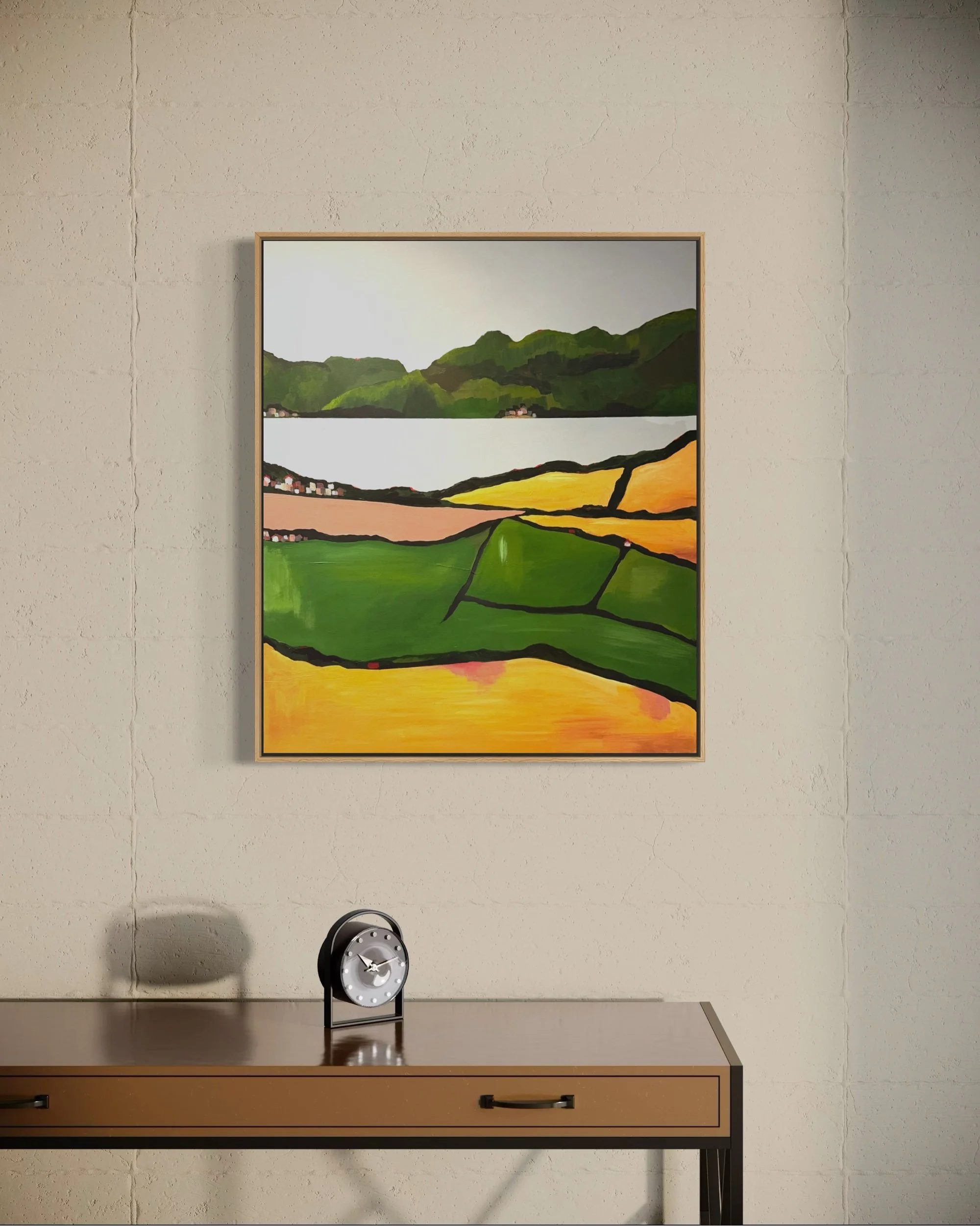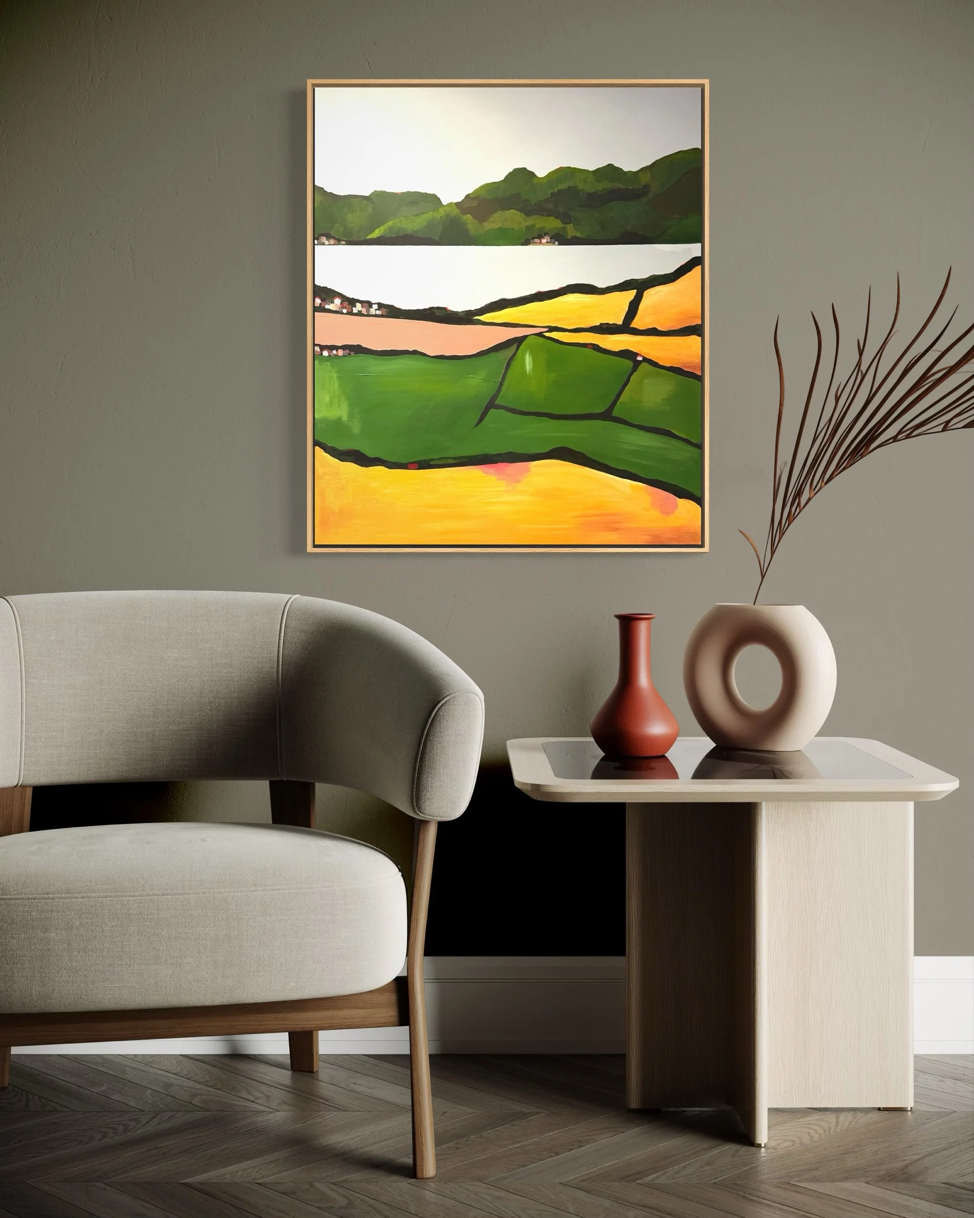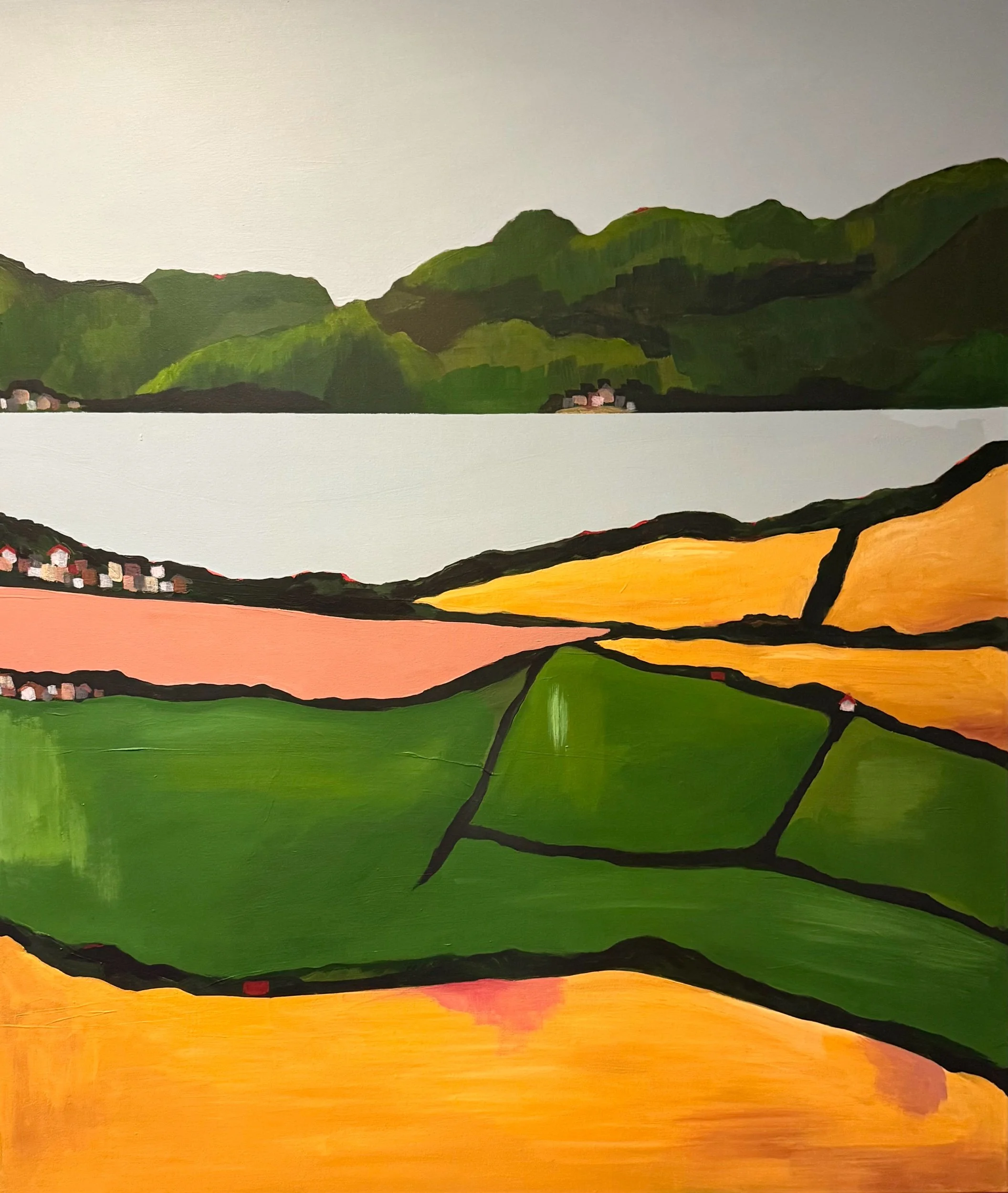 A contemporary interpretation of the landscape surrounding Padstow, Cornwall, this painting captures the distinctive patchwork of fields and rolling hills that frame the Camel Estuary. Bands of vivid green, golden ochre and soft earth tones stretch across the canvas, divided by bold, expressive lines that echo the rhythms of the land.